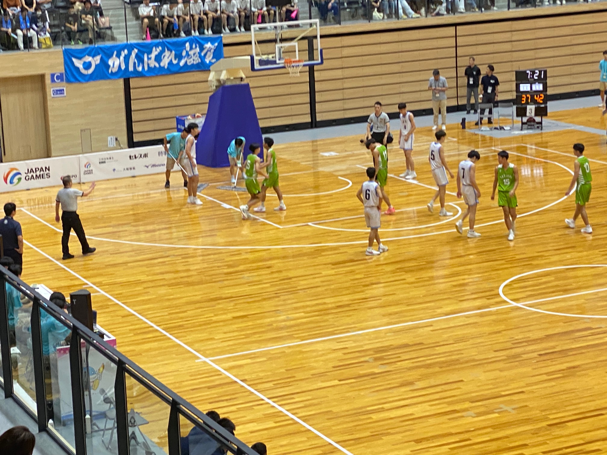ました。ちょうど少年男子の2回戦鳥取県との試合が行われておりました。本当に有り難いことだと思いますが、地元の方々の凄まじい応援で、点差が詰まり、ついに逆転しての勝利となりました。開催地ならではの凄いことです。