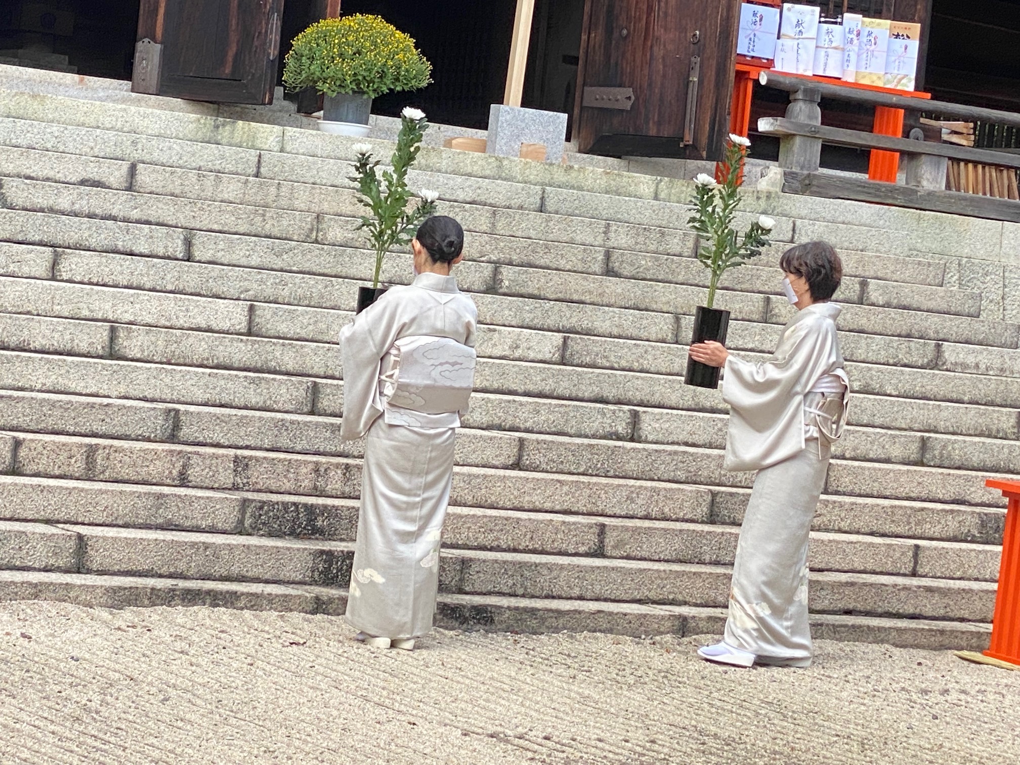 神饌を供し、続いて「献納の儀」が行われます。まずは「むべ献納の儀」、次に「創美流献華式の儀」、最後に「清和四條流包丁式の儀」が献納されます。その後、宮司が祝詞を奏上し、参列者が玉串を奉り拝礼します。