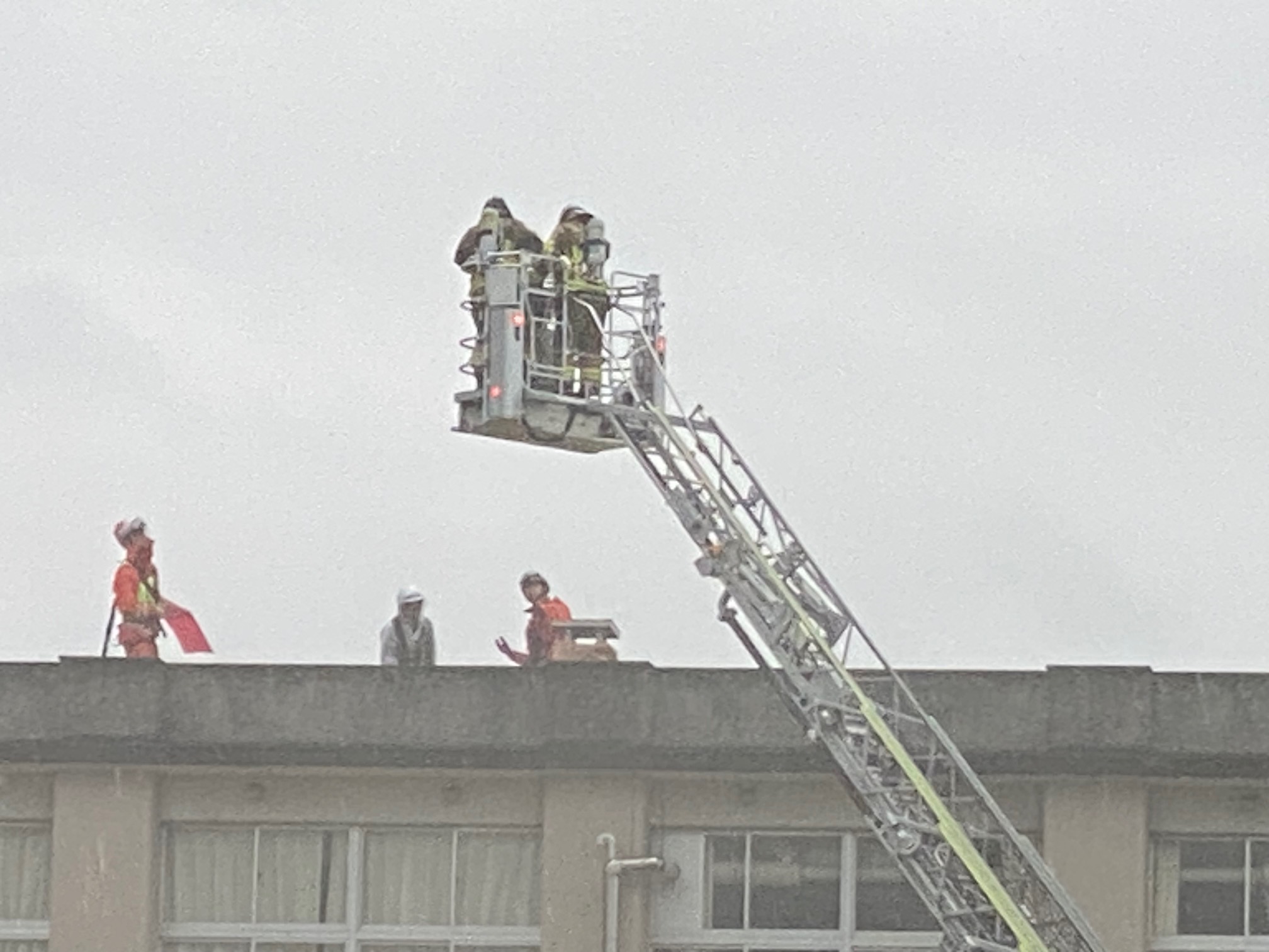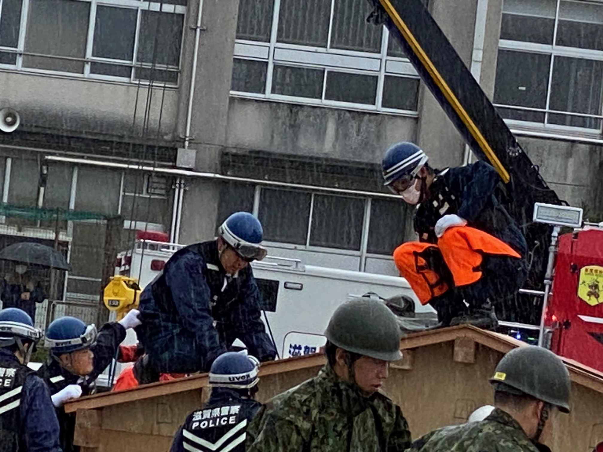 10時30分からは、土砂災害や火災等を想定した総合訓練で、救急、はしご車、レスキュー等の消防、地元消防団、病院医師、警察、自衛隊が救助作業を、大津市と災害時の協定を結ぶ建設業協会、ガス水道業協会が復旧作業するなど、続々と各団体が参加し連携した作業が展開され、実際の災害時に即応した訓練となりました。