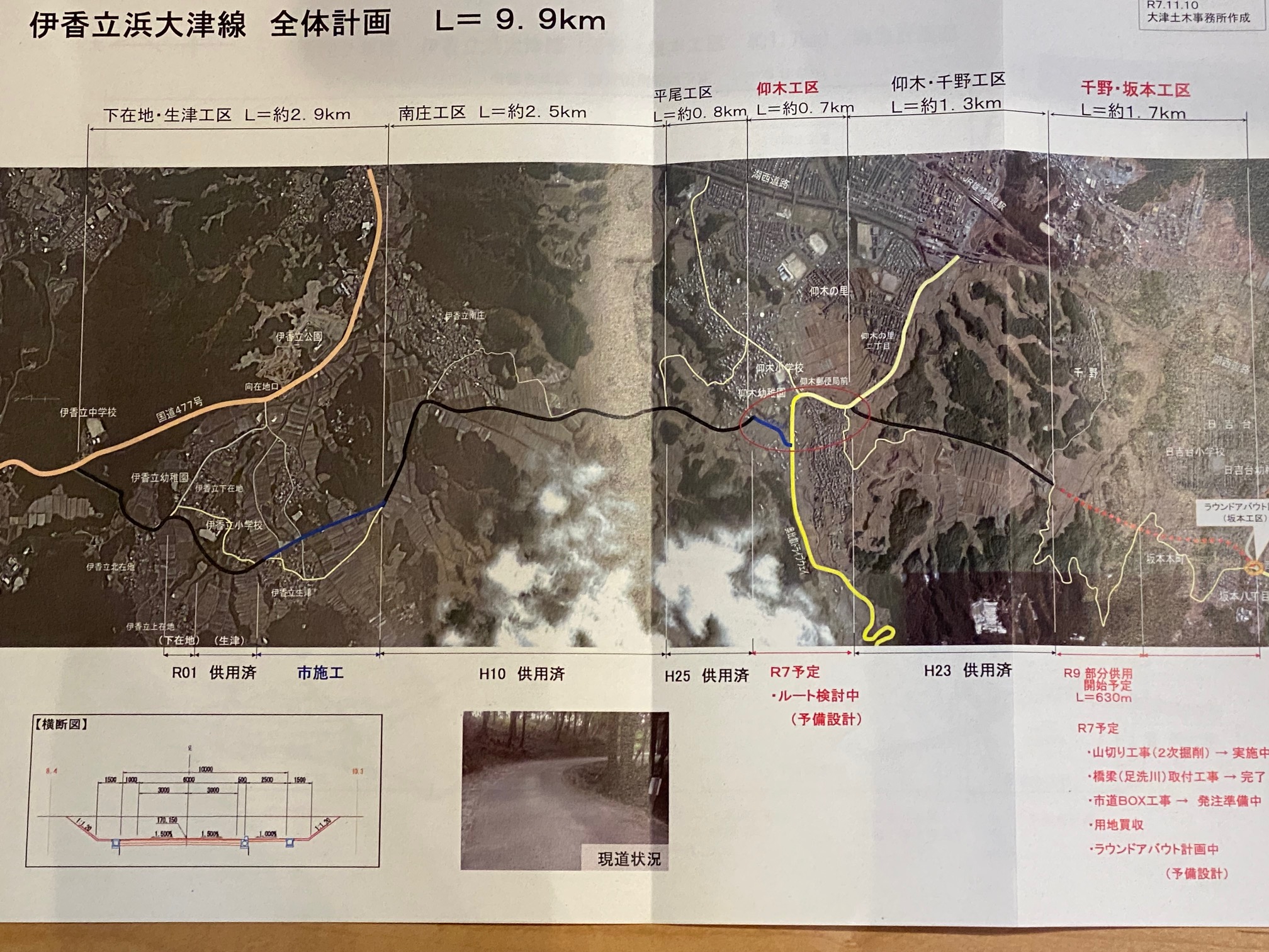 平成10年に伊香立南庄工区、平成23年に仰木・千野工区、平成25年に仰木平尾工区の供用開始し、さらに、令和元年に伊香立の下在地から生津まで供用を開始しています。残る課題は仰木の県道と市道が交差す地点のルート検討と千野・坂本工区となります。土地買収はほぼ完了しているとのことで、現時点では令和10年3月に供用開始を目途としています。