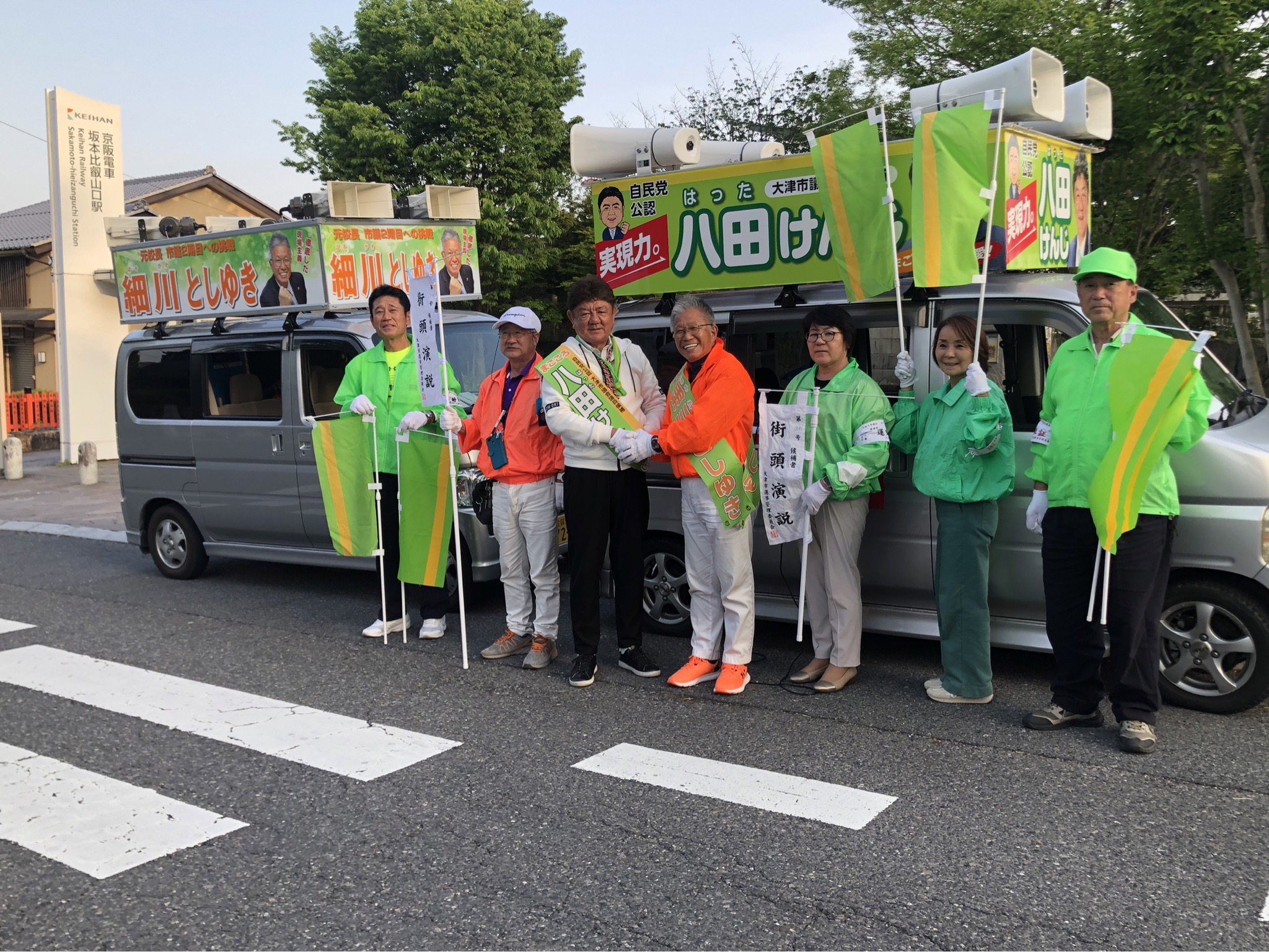 5時に八田議員と合流し、京阪比叡山坂本駅前で演説会を行いました。面白い企画でした。