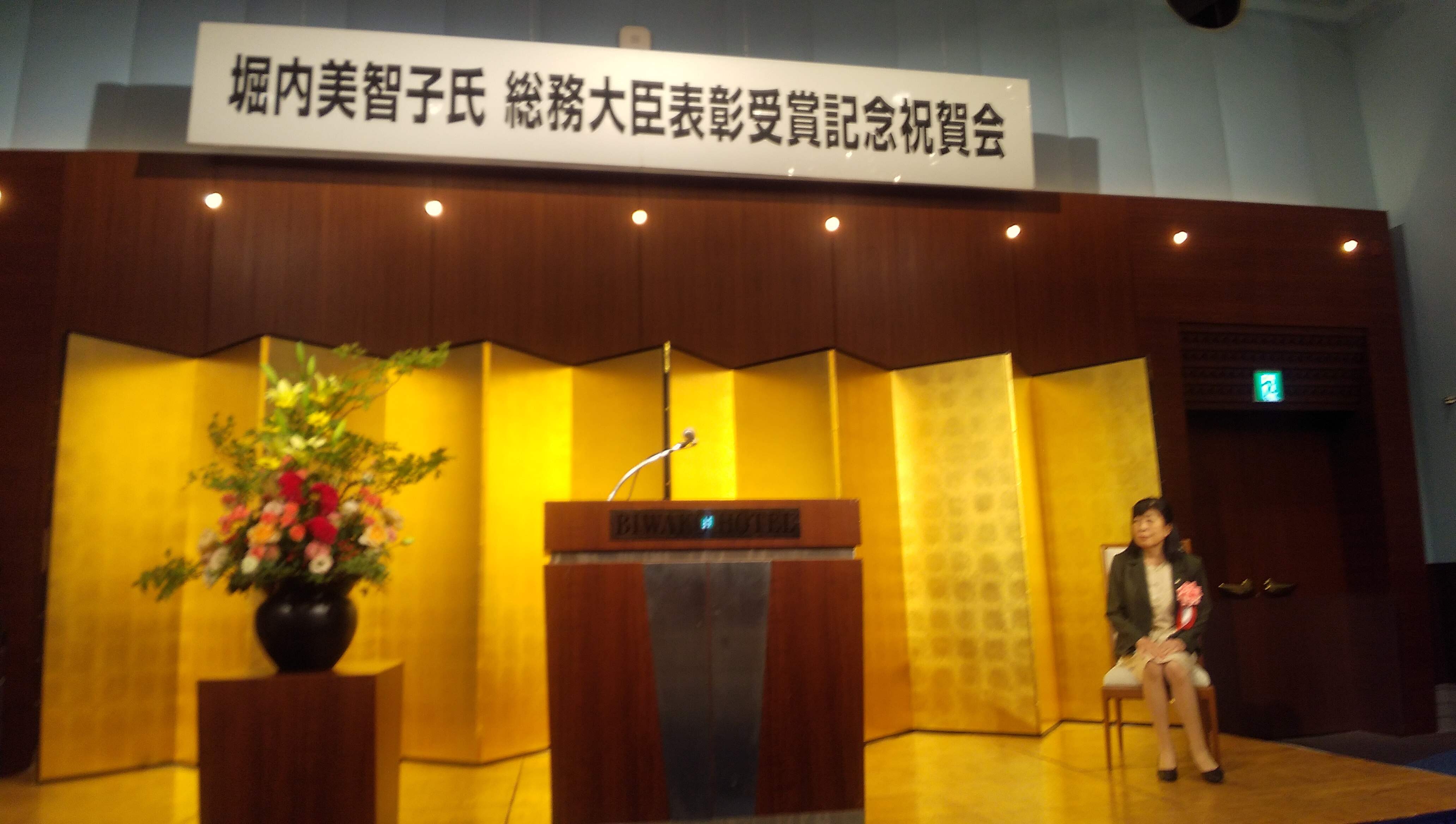 その後、夕刻から同じ会場で、滋賀県行政書士会の堀内美智子先生の総務大臣表彰受賞記念祝賀会に出席しました。お姿から優しい眼差しと豊かな感性をお持ちの先生だと一見してわかります。本当のおめでとうございます。長く行政書士業の仕事に関わり、滋賀県行政書士会への貢献は言うまでもなく、身近な地域の法律の専門家として住民に寄り添って仕事をされ、信頼を得られてきたからこその受賞だと思います。後を追うものの目標となります。