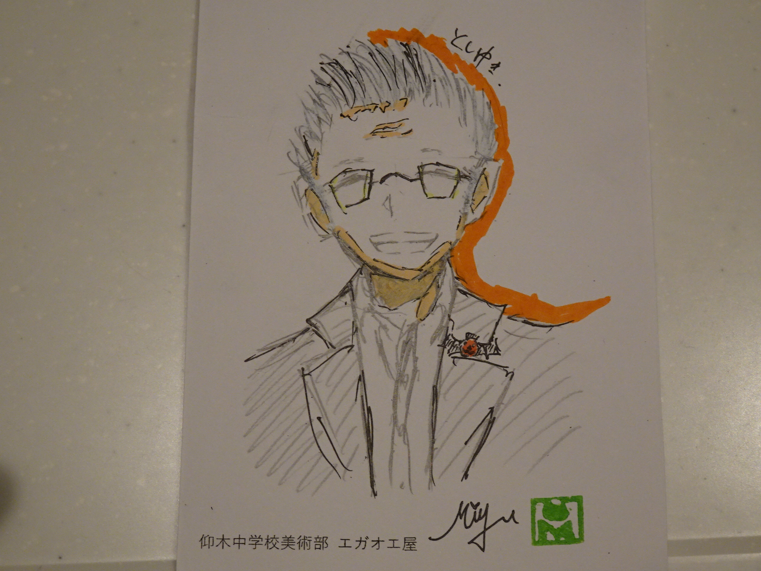 仰木中学校美術による私の似顔絵です。若くみえるように書いてくれました。ありがとう。