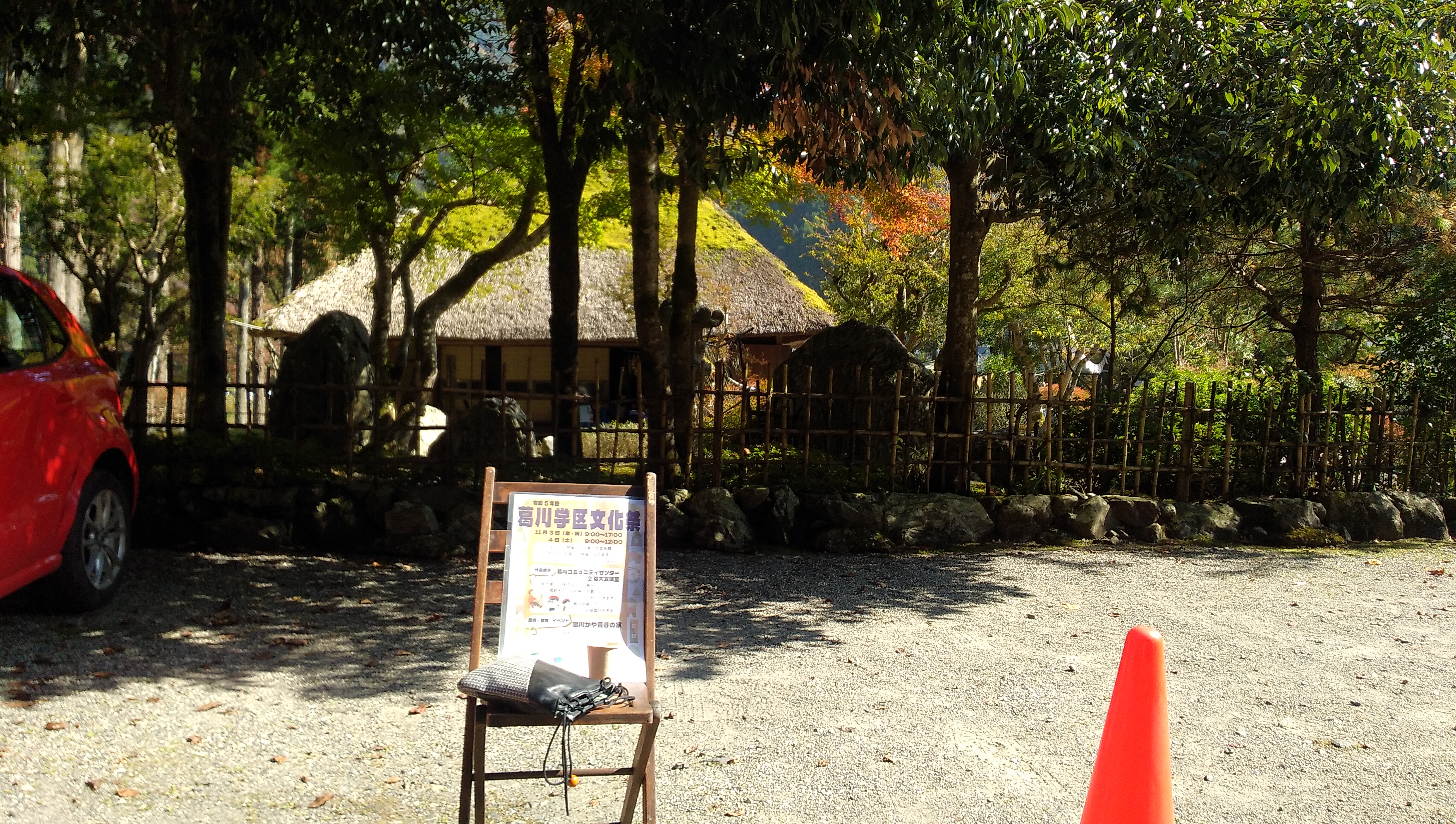 本日は、葛川の文化祭にお邪魔させていただきました。市民センターでは展示が行われ、駐車場では朝市で野菜などの販売が、かや葺きの家では小物の販売やコーヒーやお弁当の販売、抹茶の接待も行われていました。コーヒーとおにぎり弁当は美味しかったですね。多くの地元の知人とお出会いすることができ、良かった。