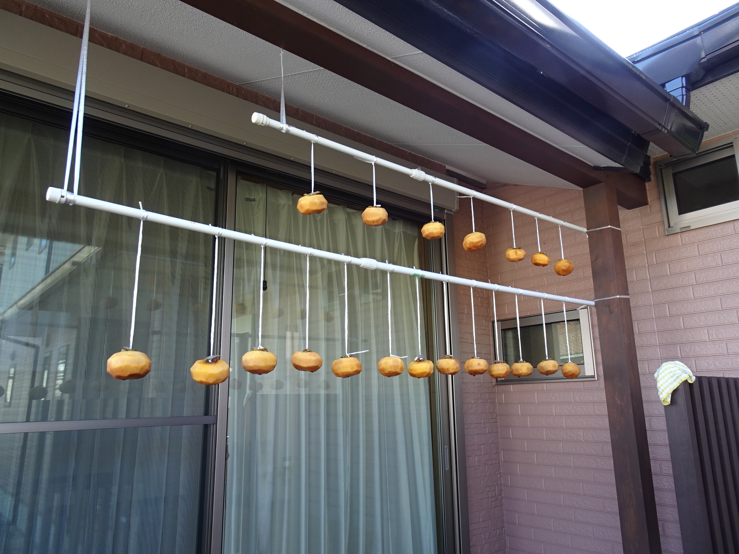 昼前に帰宅し、昨日皮をむいた渋柿をつるしました。