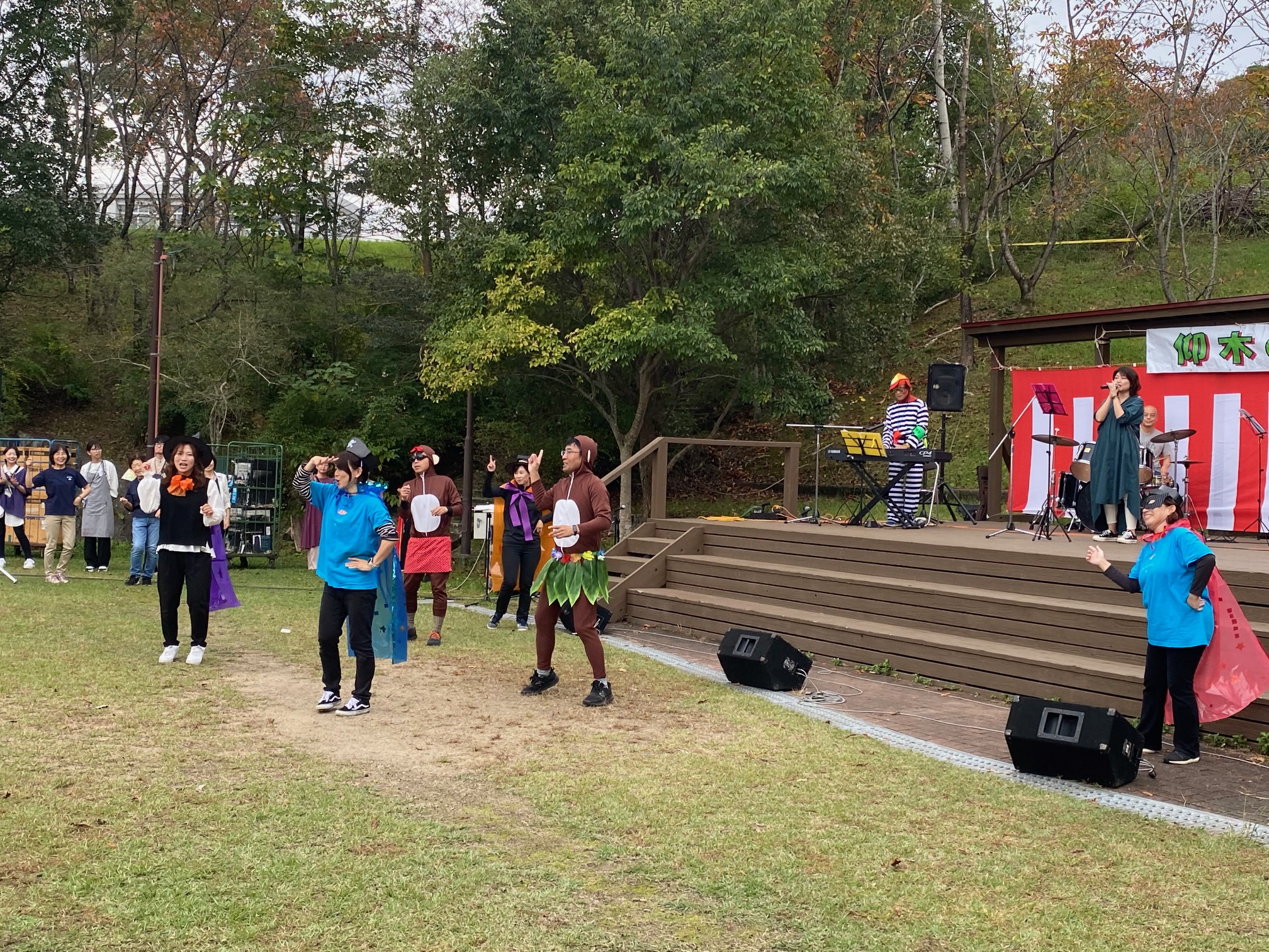 太鼓の演奏のオープニング、仰木中学校吹奏楽、幼稚園児のうた、地域有志のバンドに手話サークルや幼稚園、小学校の園長・校長等によるダンス、ハロウィン仮想大会など盛りだくさんの出し物、各種団体のざるそば、焼きそば、唐揚げなどの出店で大変な賑わいとなりました。仰木からも焼き芋の出店がありました。準備・運営に関わっていただいた方々に感謝ですね。