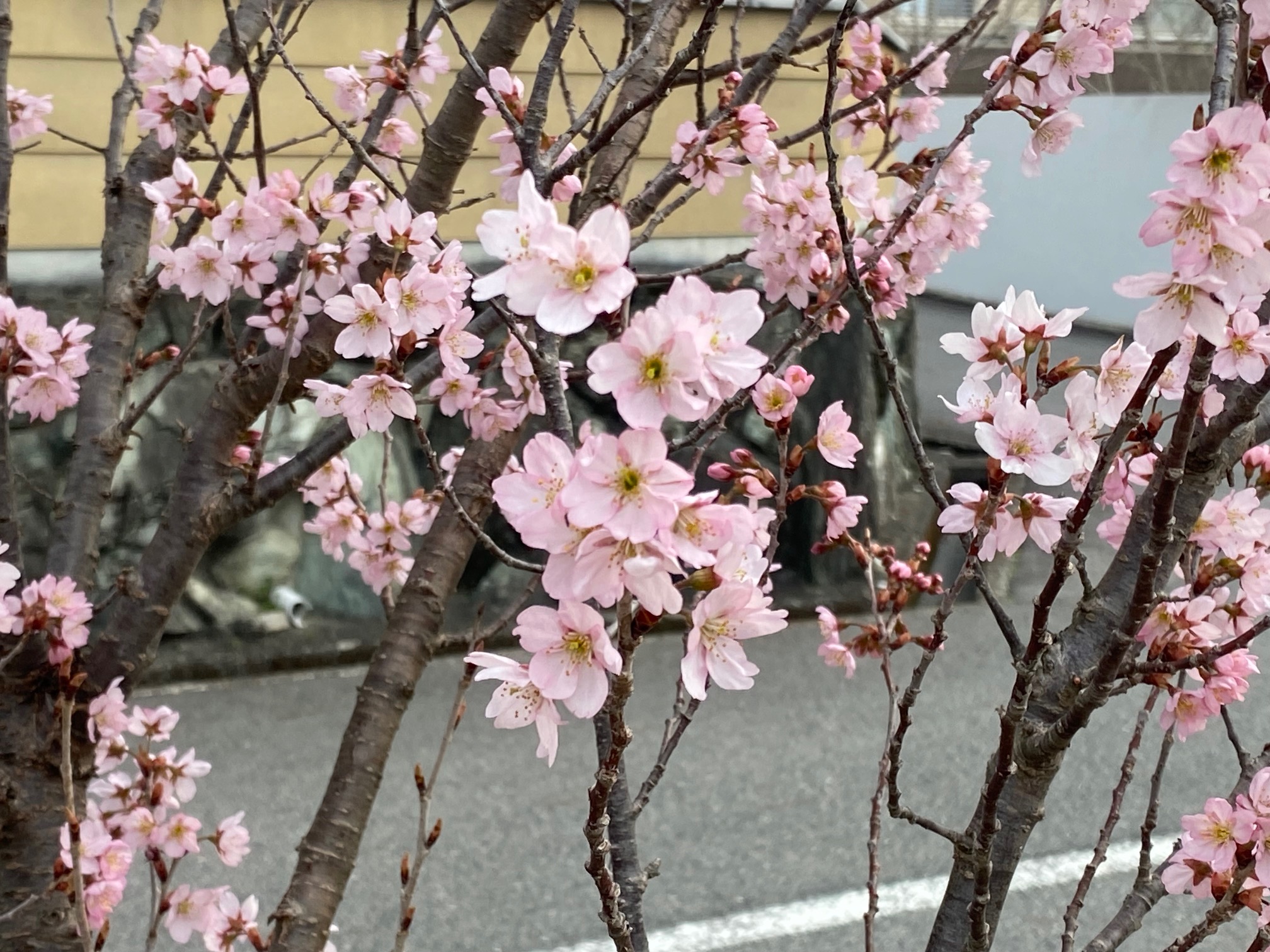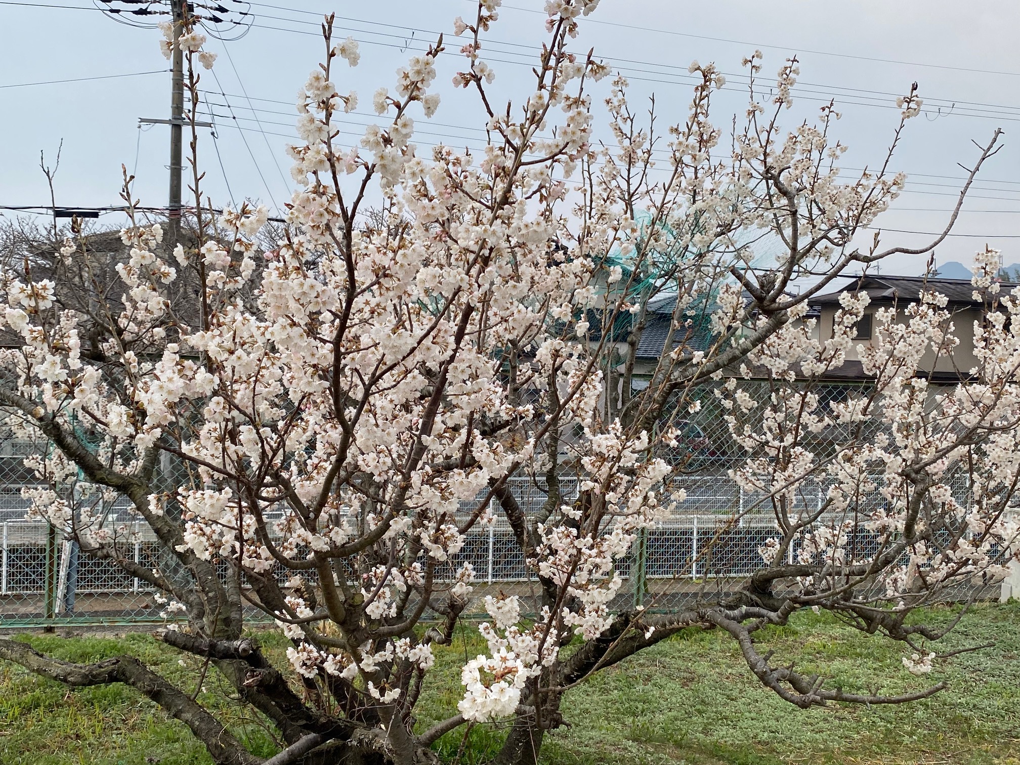 そのようななか、桜の開花宣言は間近です。すでに、朝の登校の見守り時に高橋川沿いの桜が数本咲いていて驚きました。至明こども園の駐車場にある桜は満開でしたね。さくらんぼの実が山ほどできる木です。楽しみですね。