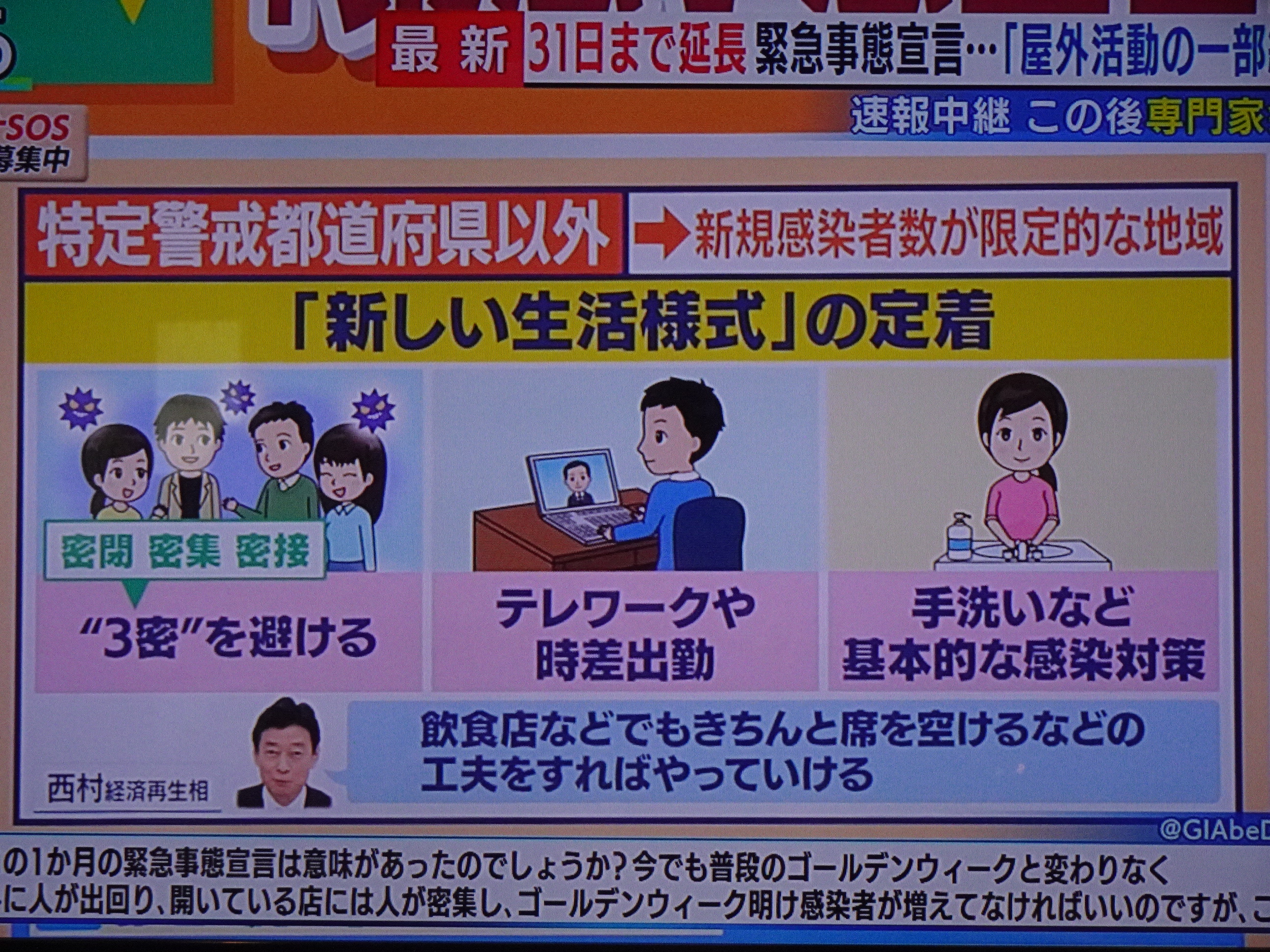 国として、13地域については現状の状況をを維持を。その他の34の地域について、外出の自粛は、大きなイベント以外、三密を避けた環境など感染予防をすることを条件に緩和する方向を示唆し、休業要請は、各県の判断に委ねるとし、職場出勤についても、テレワークなどをすすめながらも対象から除外するとしました。学校の再開については、段階的にすすめていくとして、小学校1年、6年、中学校3年を優先的に登校させてはとしています。