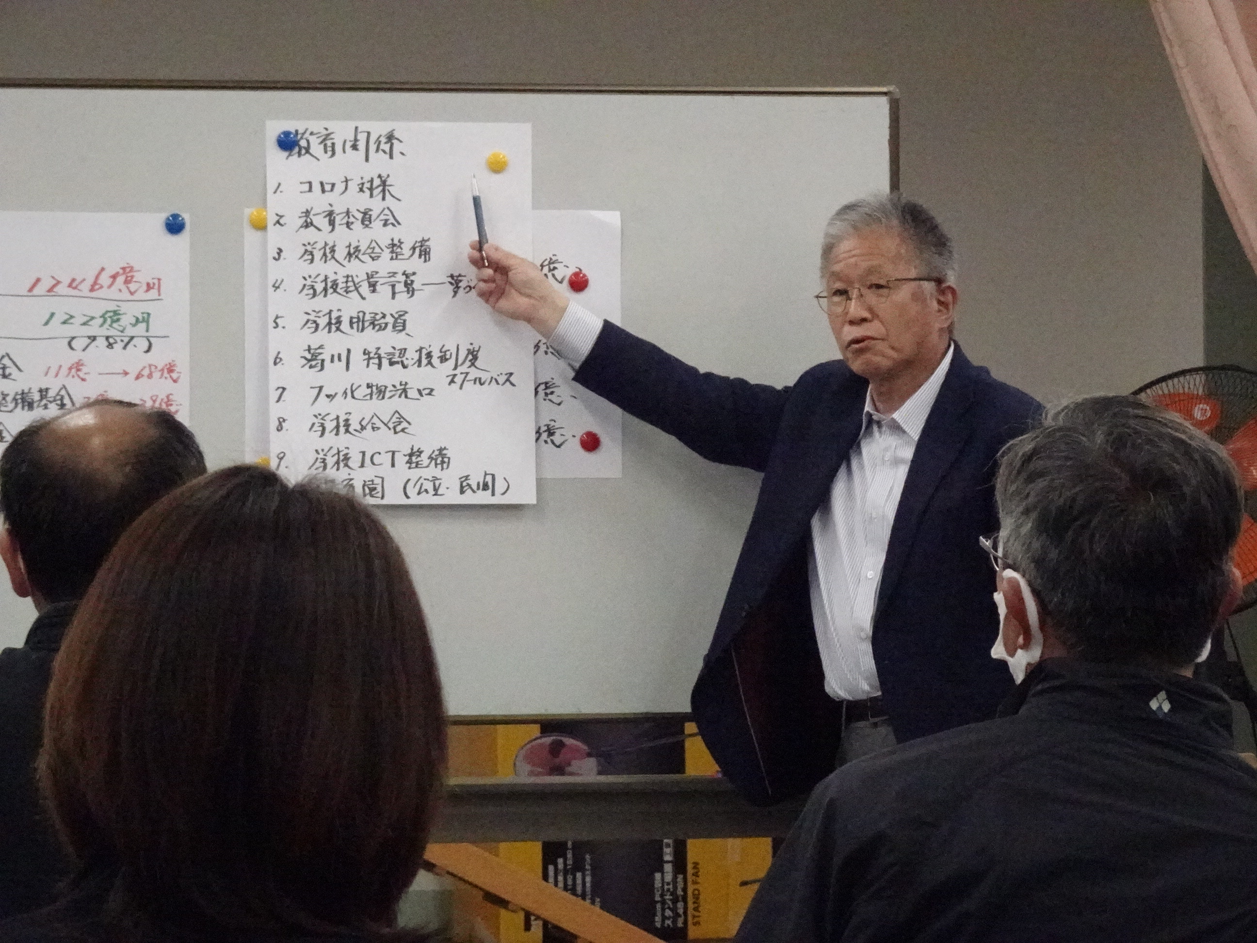 さて、座談会の内容の前半は昨日と同じ内容で、大津市全体の予算ついて、とりわけ教育予算や教育行政についてお話をさせていただきました。